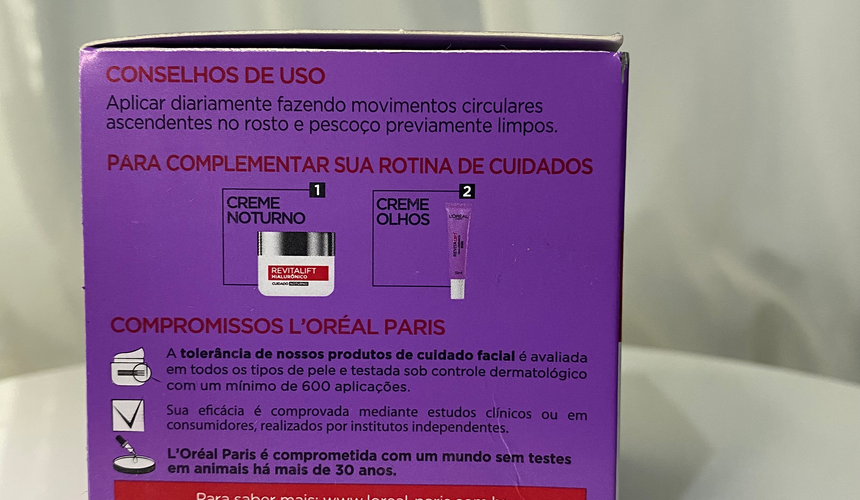 “Para combater os sinais do envelhecimento, descubra a gama completa Revitalift Hialurônico. Enriquecido com Ácido Hialurônico puro, componente naturalmente presente na pele e responsável por reter a hidratação, o novo Revitalift Hialurônico hidrata intensamente por 24h, preenche linhas de expressão e revitaliza a pele. Sua textura leve pode ser aplicada em todos os tipos de pele, garantindo uma melhora global em seu aspecto.”